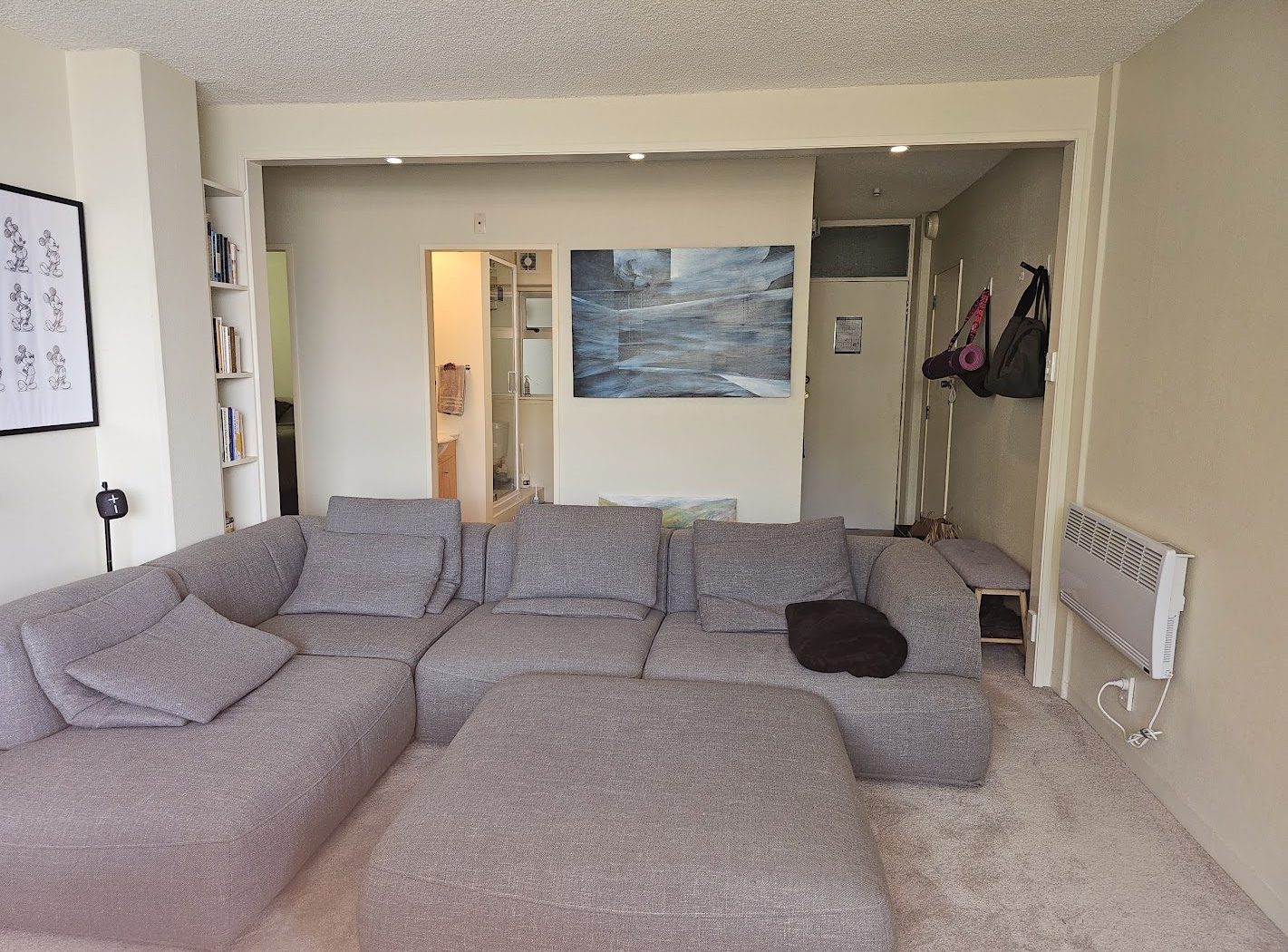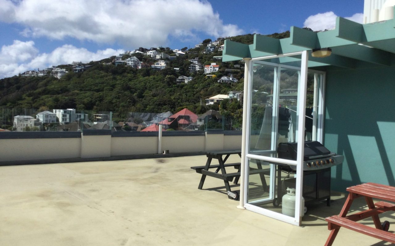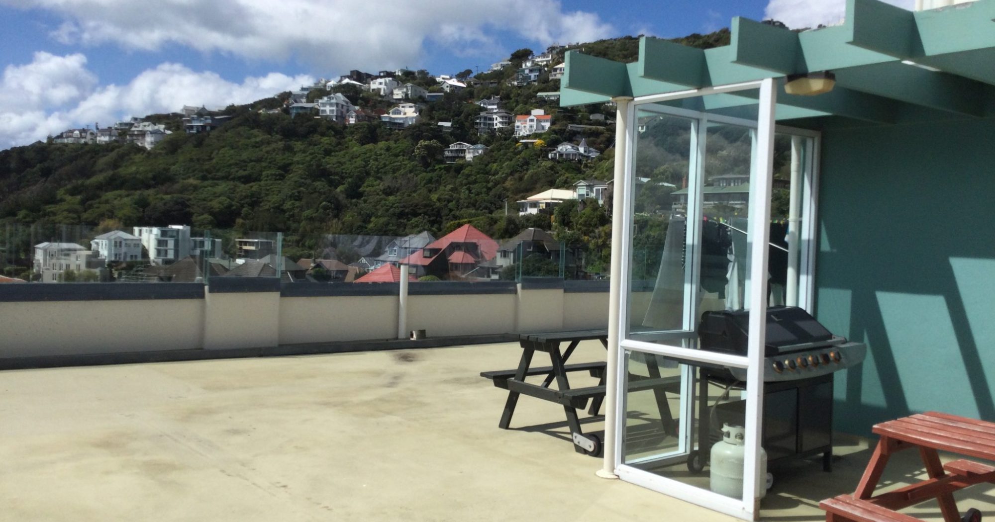 Being in Oriental Terrace, the property is a very short walk to Courtenay Place, Freyberg Pool, cafes, and, of course, a quick stroll to the beach. There are two bus lines (#14 and #24) that service Oriental Bay. An added bonus is that the apartment complex has a very spacious common-use roof garden with spectacular views of the harbour and the bush. There are barbecues, bench tables, a small kitchen, a common drying line for clothes, as well as toilet facilities on the roof.